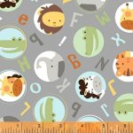 Alphabet buddies on gray flannel. Cubby Bear designed by Whistler Studios for Windham Studios. 100% cotton flannel. 44" wide.