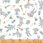 Bunny Hop on white flannel. Cubby Bear designed Whistler Studios for Windham Studios. 100% cotton flannel. 44" wide.